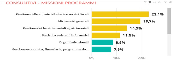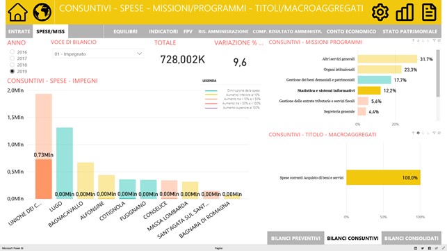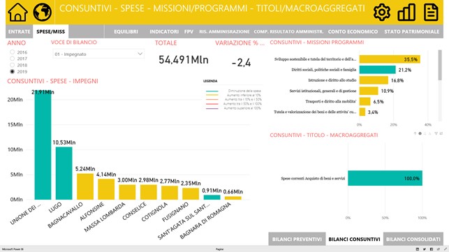 da cui si vede che i valori totali e la variazione percentuale sono ora aggiornati per il Comune selezionato, e contestualmente anche la suddivisone per Missione e per la voce contabile “spese correnti acquisto di beni e servizi”.