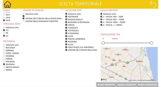 Dalla pagina relativa alla "Scelta del Territorio" si possono selezionare per il 2019 tutte le Province, tutte le Unioni e tutti i Comuni. Si seleziona quindi la fascia territoriale per i Comuni con popolazione maggiore di 100.000 abitanti, e si ottiene la seguente pagina: