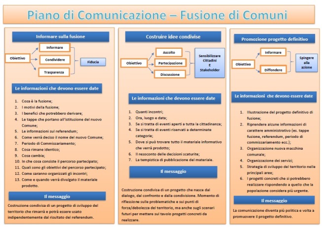 La comunicazione è un’attività che supporta l’intero percorso di fusione con la sola esclusione del “silenzio elettorale” a partire dalla data di pubblicazione del decreto del Presidente della Giunta regionale di indizione del referendum consultivo sul Bollettino ufficiale della Regione e fino alla chiusura delle operazioni di voto. Richiede una forte condivisione tra i Comuni partecipanti in merito alla tempistica delle azioni e dei messaggi che si vogliono divulgare. Per essere efficace sono necessarie delle risorse stabilmente dedicate a questa attività.