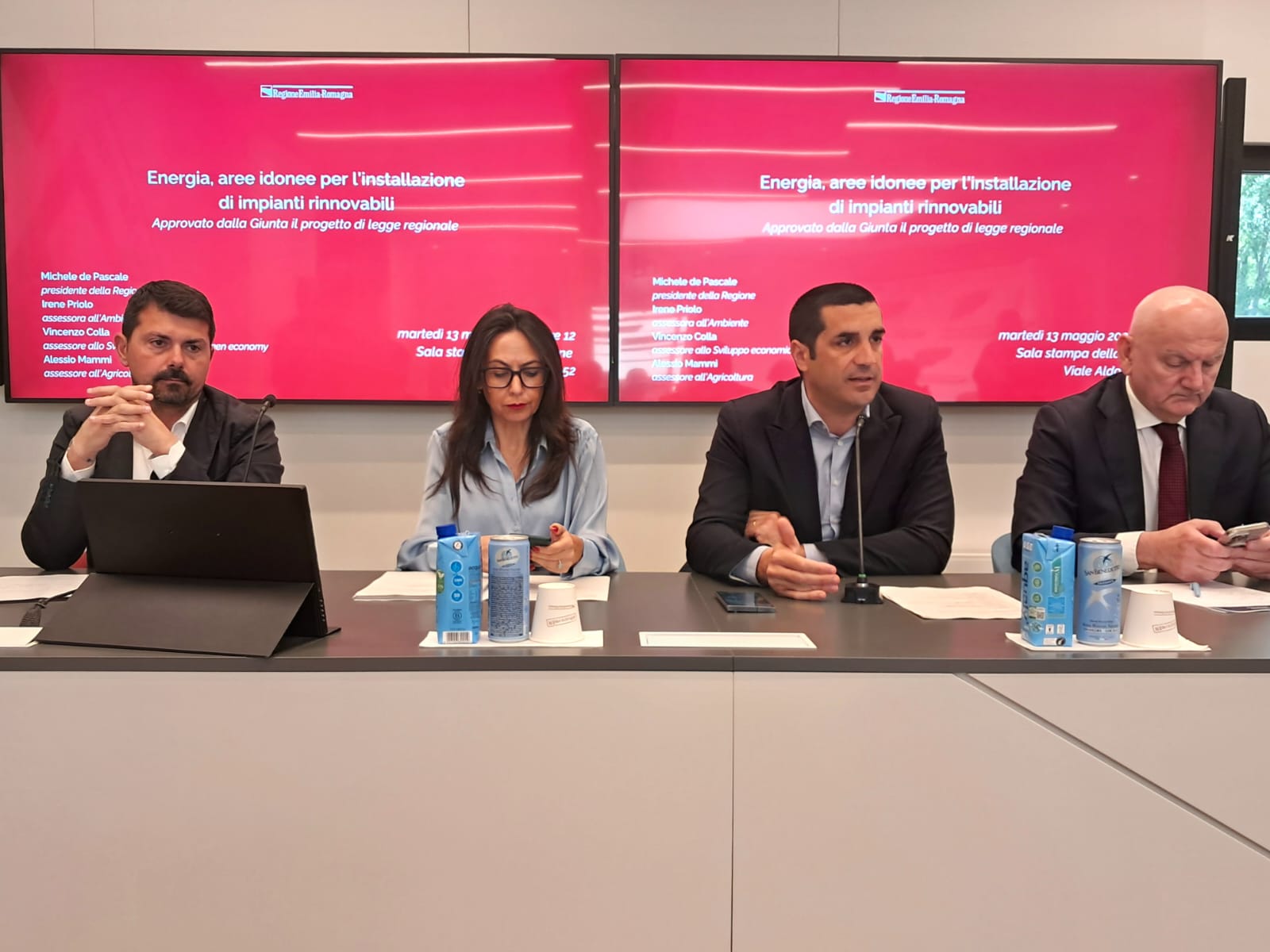 - la Giunta approva la proposta di legge sulle aree idonee per l'installazione di impianti alimentati da fonti rinnovabili (nella foto da sinistra l'assessore all'Agricoltura Alessio Mammi, l'assessora all'Ambiente Irene Priolo, il presidente Michele de Pascale e il vicepresidente Vincenzo Colla (13 maggio 2025)