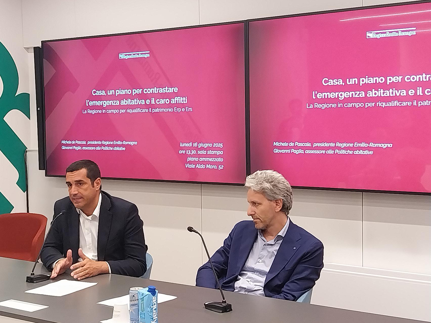 - il presidente Michele de Pascale e l'assessore alle Politiche abitative Giovanni Paglia presentano il piano per contrastare l'emergenza abitativa e il caro affitti (16 giugno 2025)