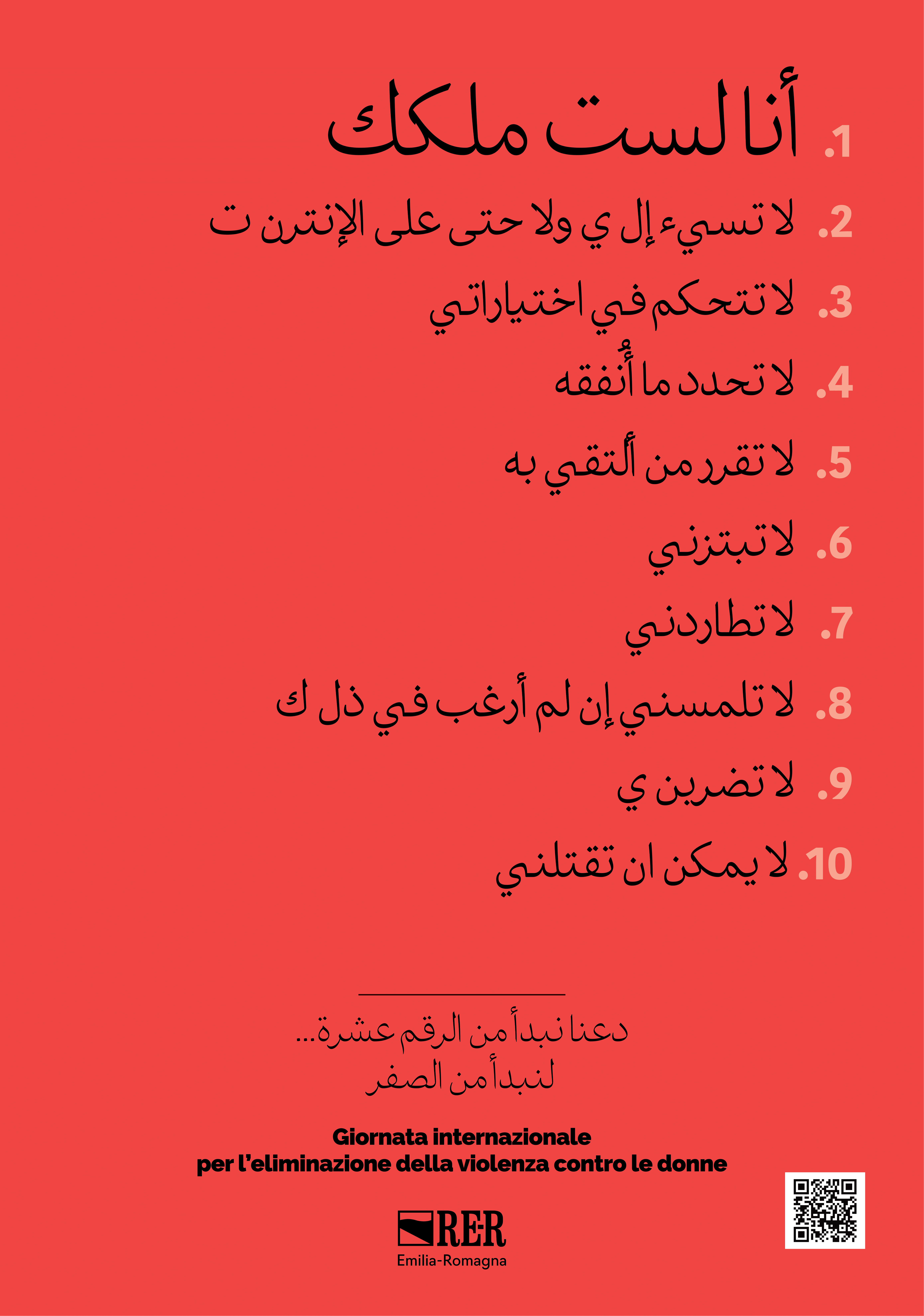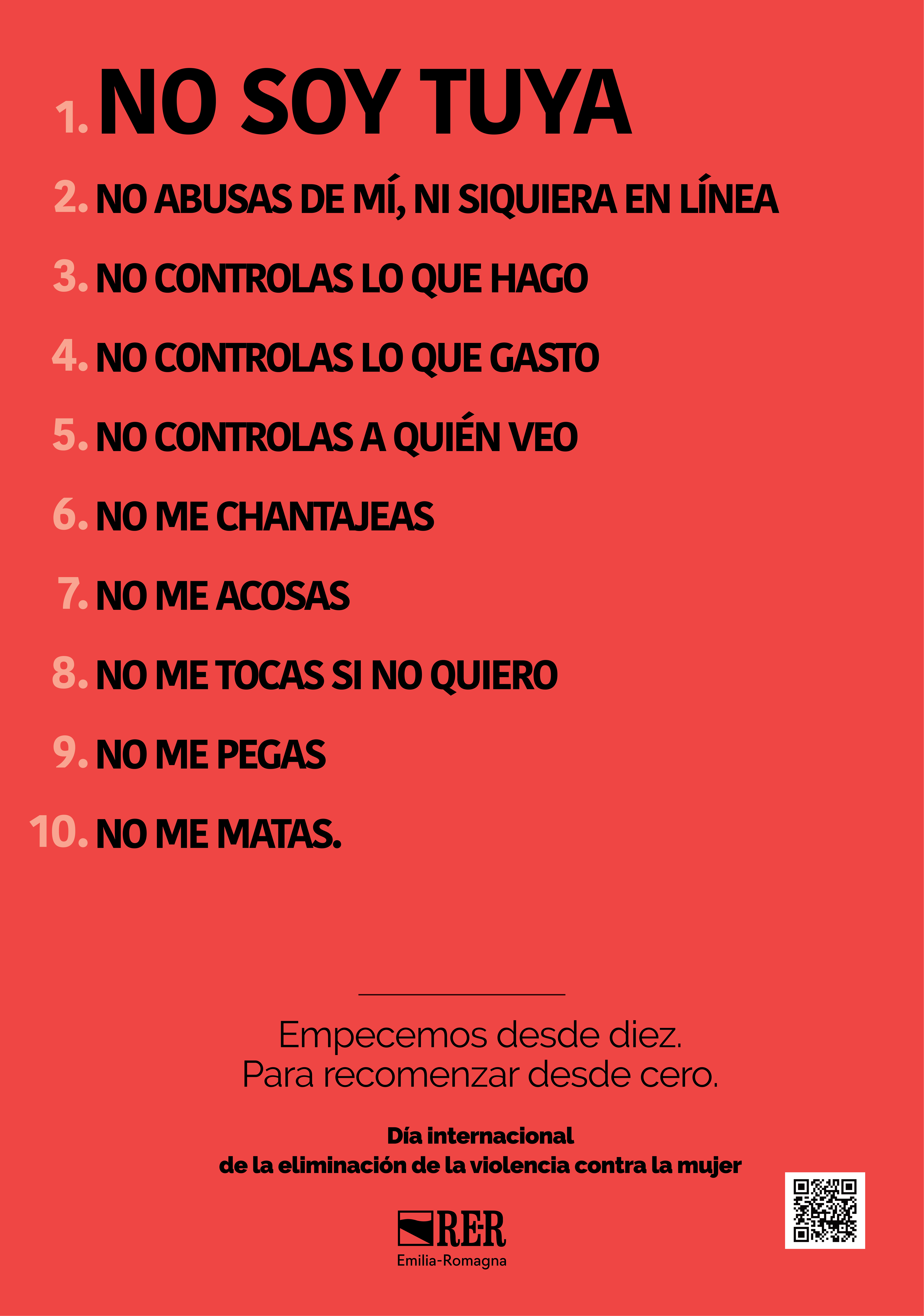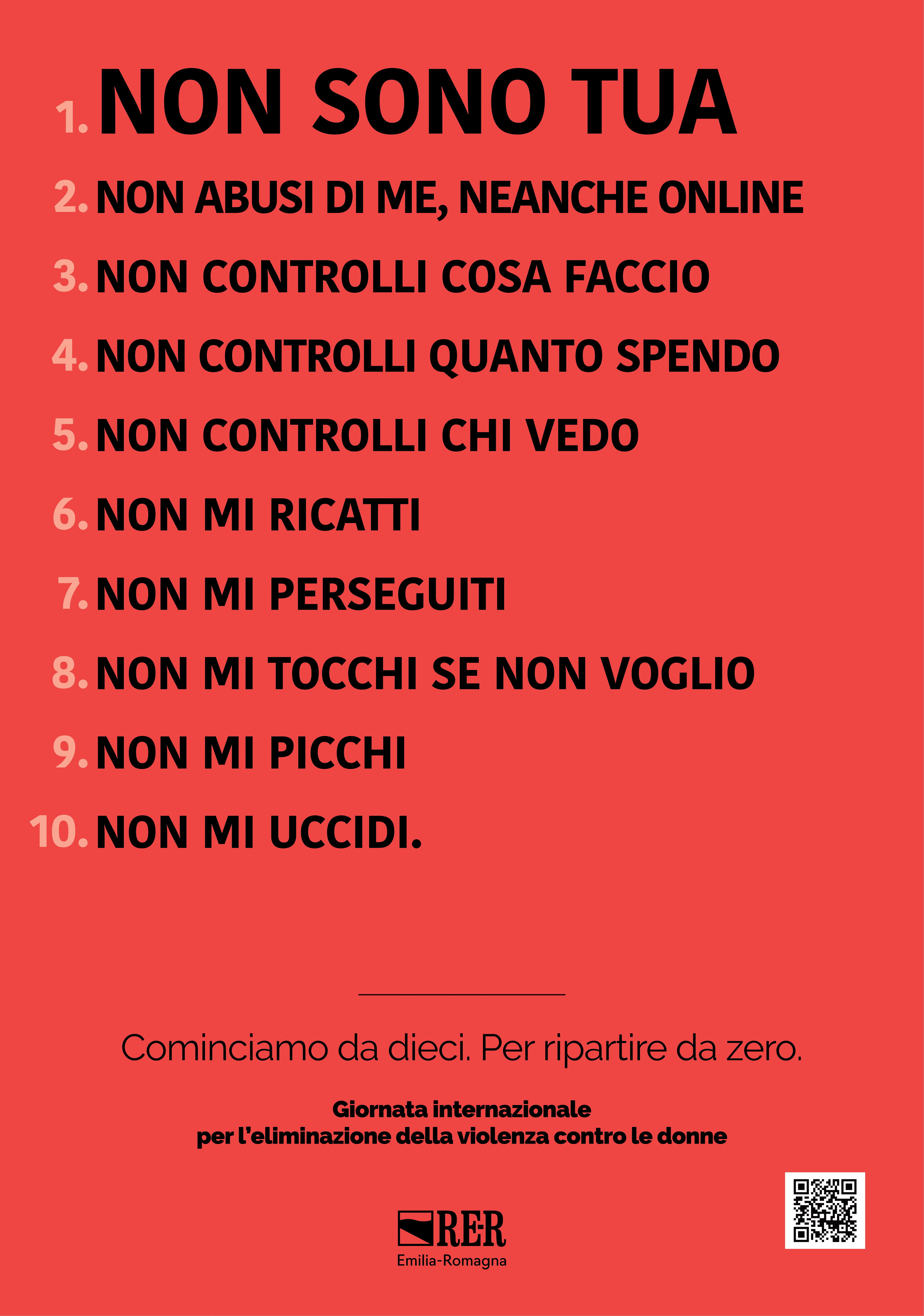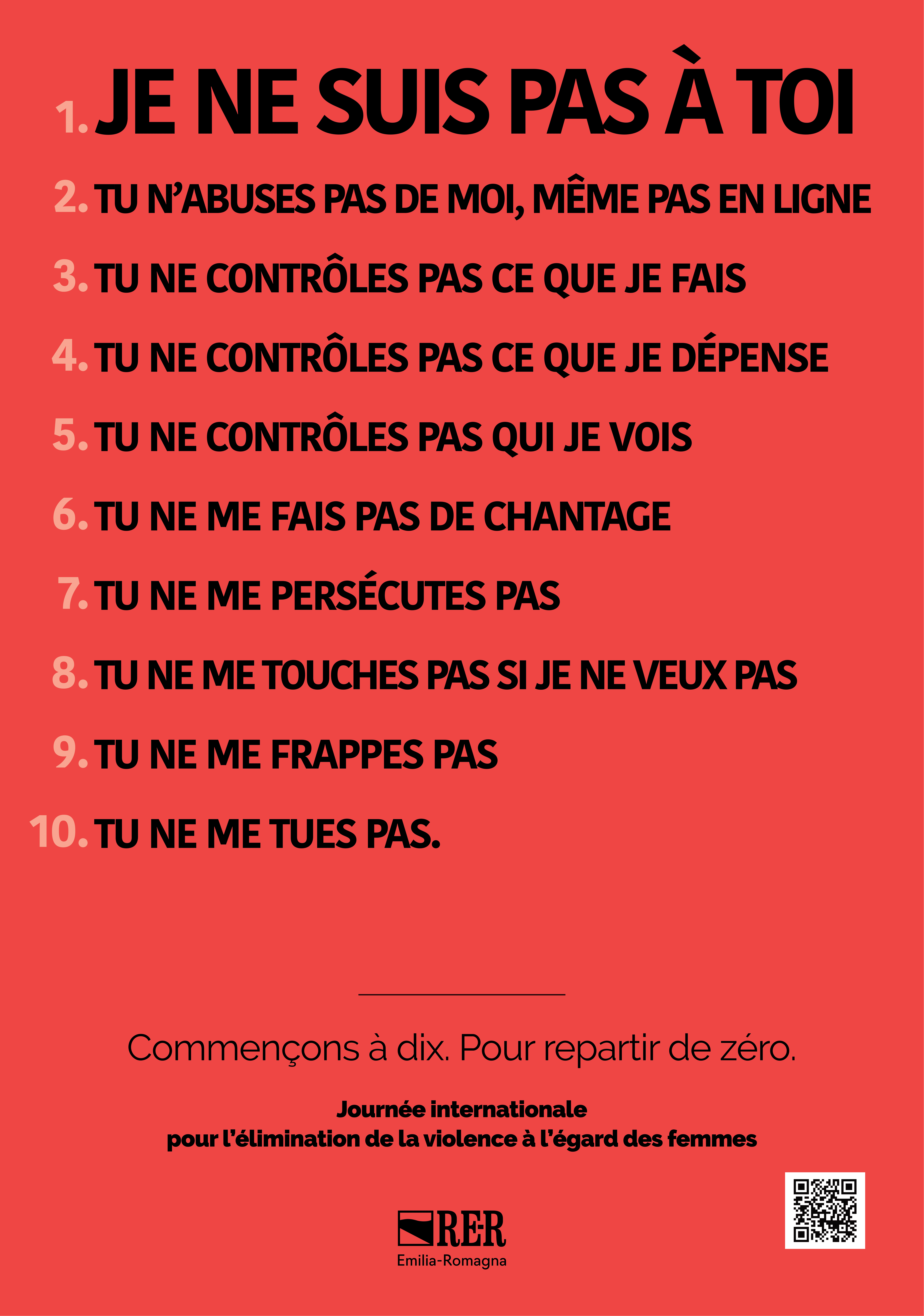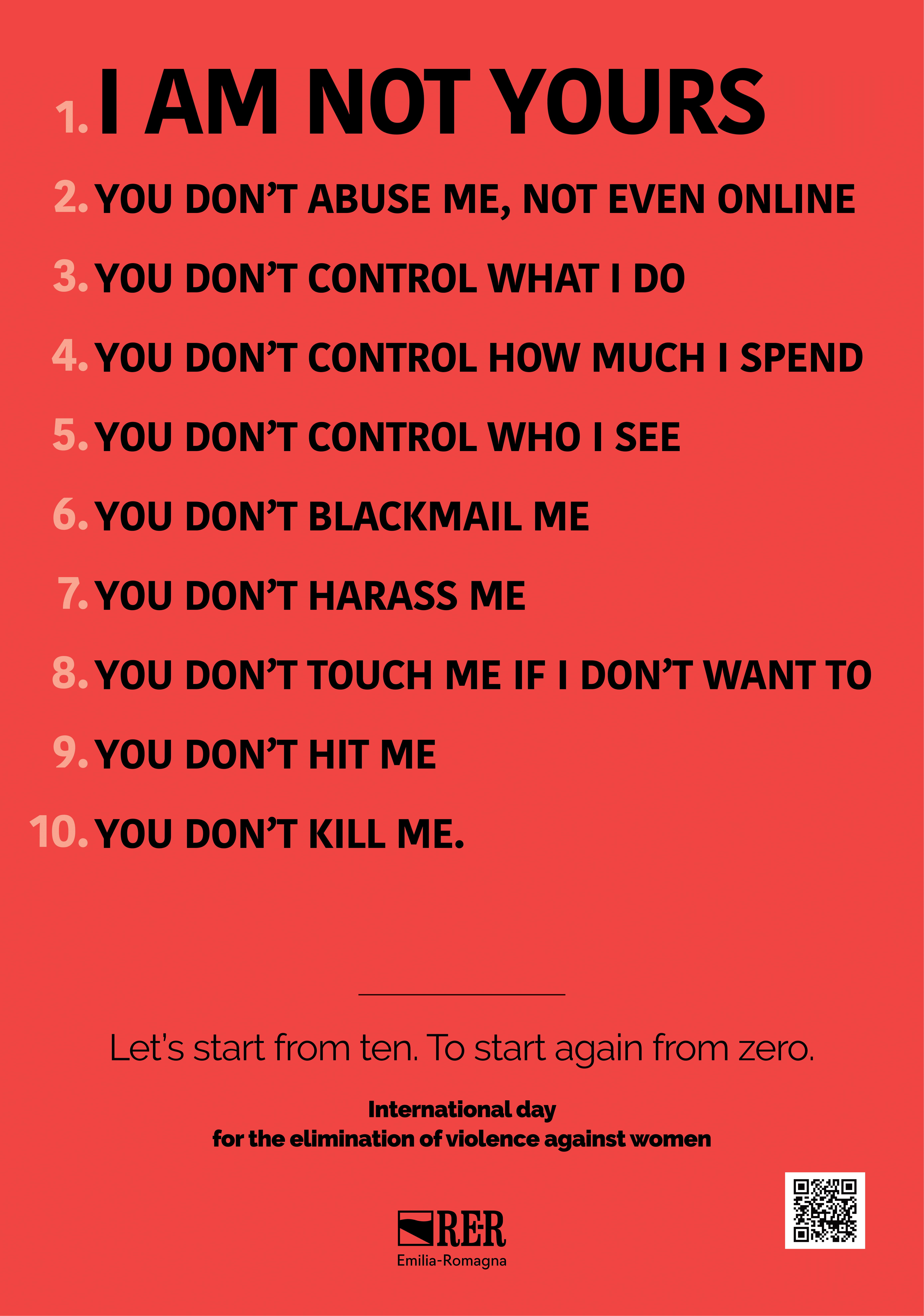 Questa campagna multilingue è un coro di dieci ‘NO’, è un decalogo di divieti. Il primo è il principio fondamentale da cui discendono tutti gli altri: ‘Non sono tua’